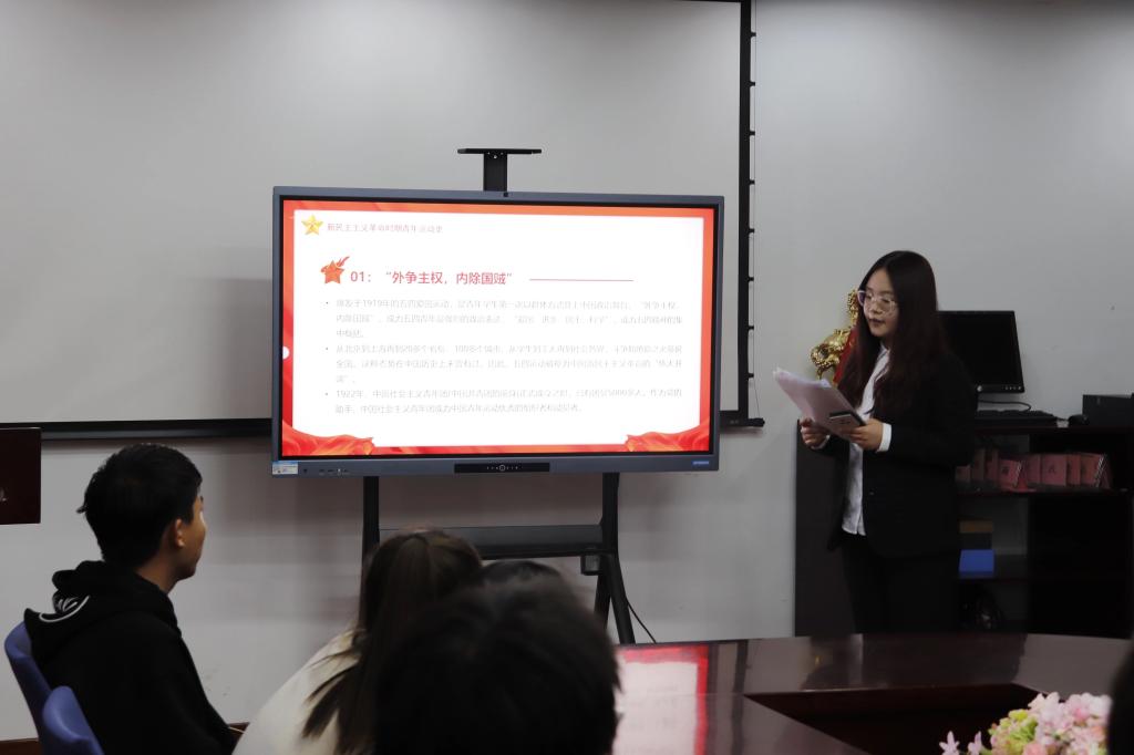 包美涵就“青春挺膺担当—青春之我,创造青春中国”为主题,带领同学们深入领悟党领导下的中国青年运动百年历史,并以实现中华民族伟大复兴为己任。活动中她从新民主主义革命时期青年运动史,党史学习教育,青年不忘初心跟党走三个部分向同学们阐述该主题。