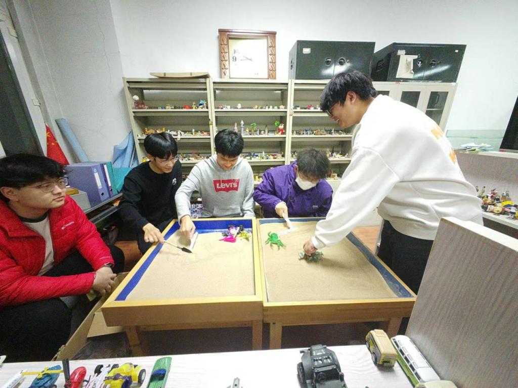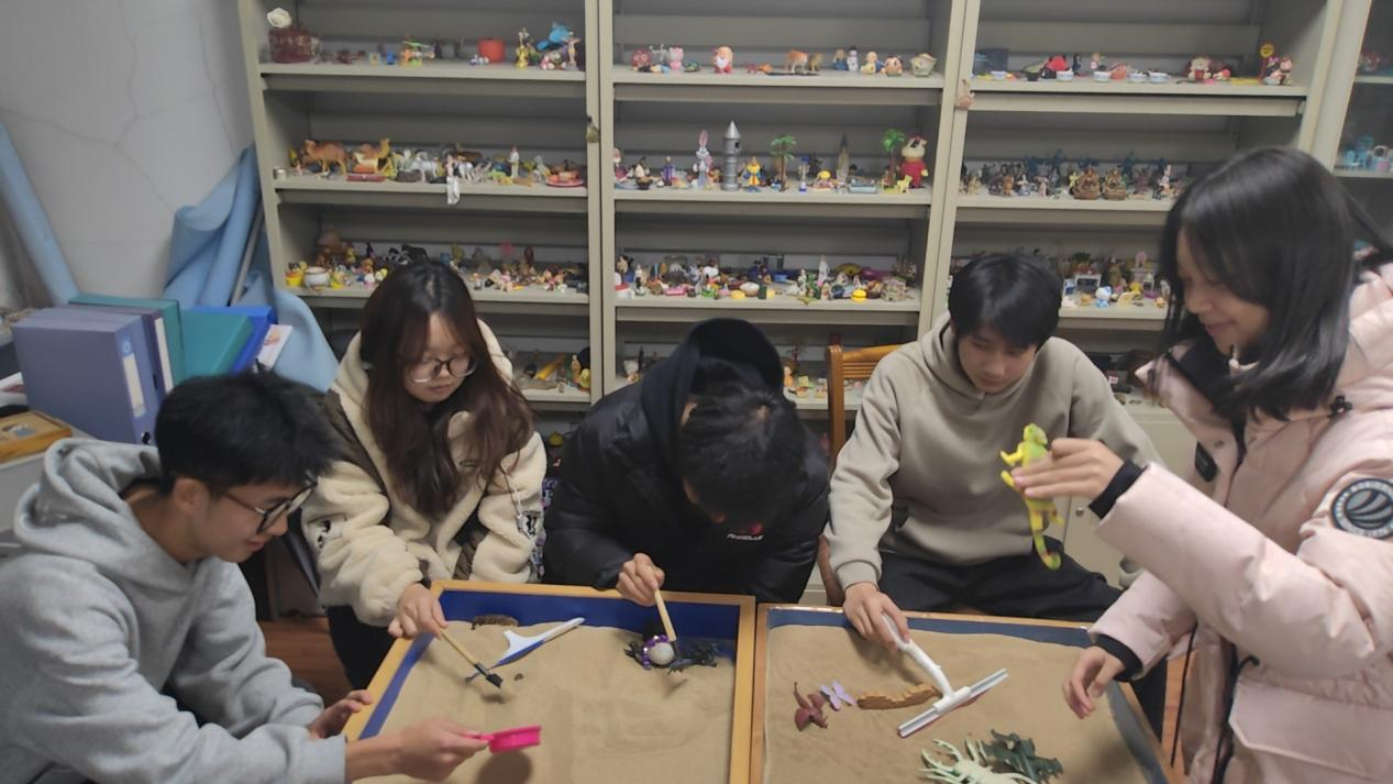 同学们依次选取沙具,按照内心所想摆放在沙盘中,通过几轮的选摆沙具,同学们在沙盘上构建出了各自的图案。作品完成后,团体成员各自讲述每个沙具的意义,分享自己的故事。