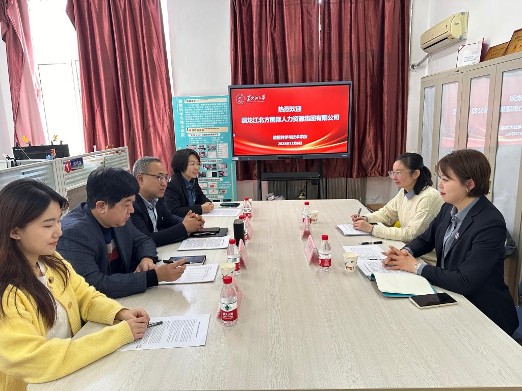 金鹏介绍了公司2024届毕业生生源情况,并从专业培养概况、专业技术水平、团队队伍建设、就业方向等方面对相关情况进行了详实介绍。黄国丰介绍了公司员工综合素质培养及学术竞赛参与情况。彭艳丽、朱晓彤介绍了黑龙江北方国际人力资源集团有限公司主要业务内容及合作设想。随后,双方就下一步校企合作进行充分讨论,双方将共同努力为2024届毕业生提供更大就业平台和更多就业机会。