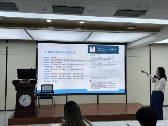 讲座伊始,孟老师强调了简历的含义和重要性,说明了简历的好坏将直接影响到求职者获取求职的机会,好的简历能大大增加拿到offer的几率,并凭借自己多年的从业经验讲述了HR在招聘过程中更看重应届生简历中实习经历、项目经历以及荣誉奖项等内容。