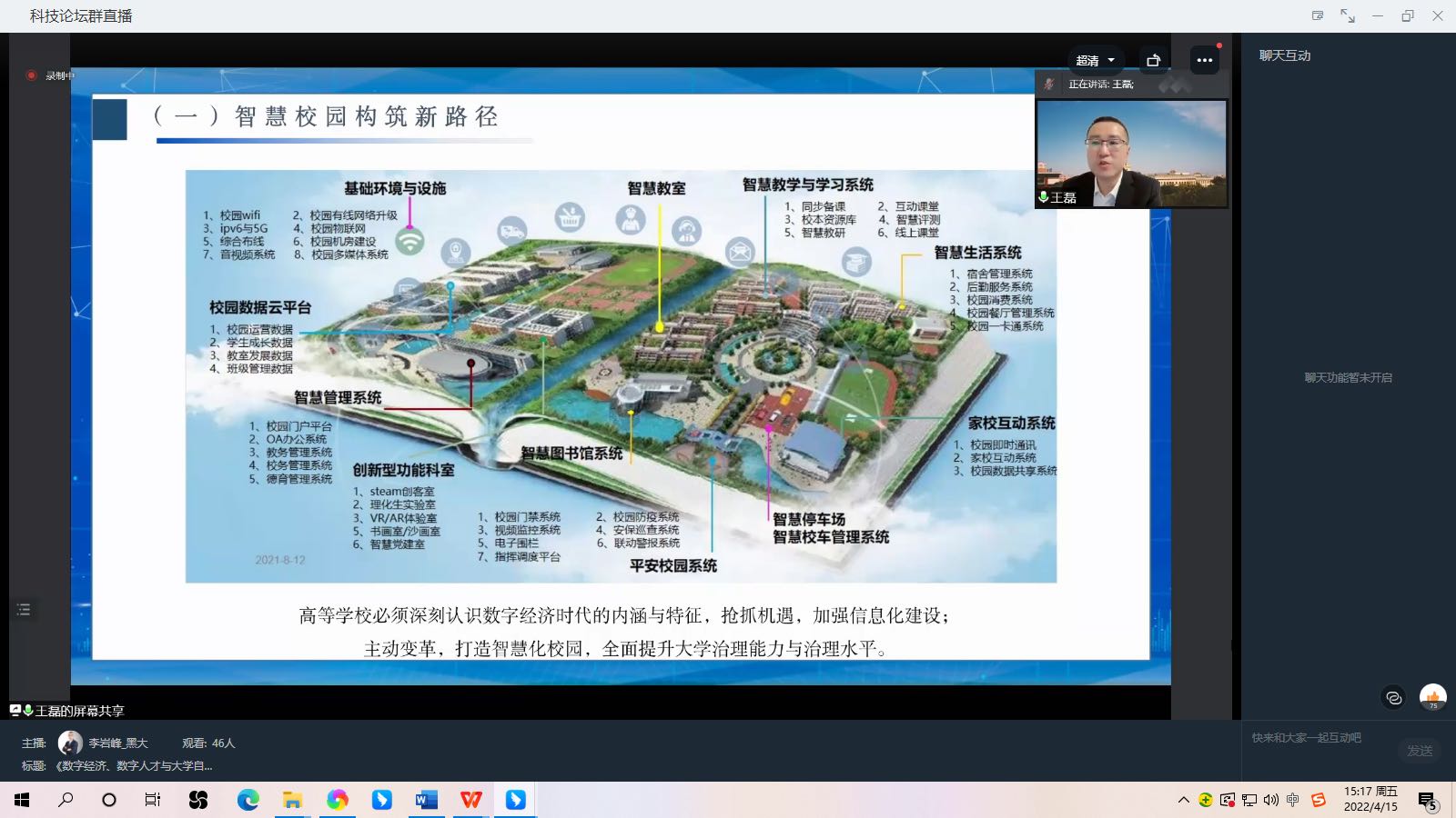 按照公司党委关于学习两会精神的部署和要求以及公司“落实两会精神 数据公司在行动”的活动安排,4月15日下午,数据科学与技术公司全体老师和部分员工通过钉钉会议直播同步收听了王磊经理以《数字经济、数字人才与大学自觉——高校数字化转型探究》为主题的报告。
