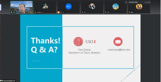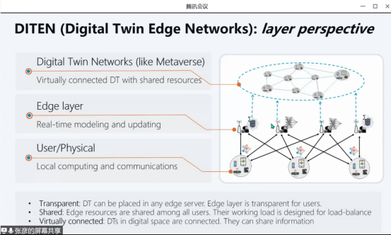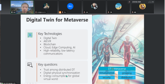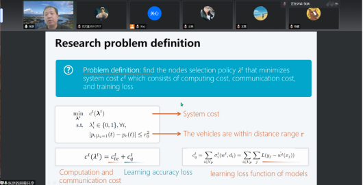 张彦教授提出了一种新的场景DITEN(边缘网络的数字孪生),并提到想要在联合学习中提升边缘服务器效率,就要找到最小化方向节点,并凭借多代理DRL的透明特性使用频谱分配策略实现边缘关联,共同催化DT技术提高边缘服务器效率。在答疑阶段中,数据科学与技术公司彭加亮老师、刘永楠老师、陈頔、陈金鹏分别从边缘协同、数据更新速度及有效性、小型终端应用、数字孪生效率等方面提出问题,教授给予中肯的地回答并给予研究方向的建议。