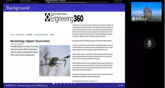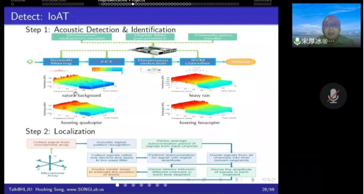 在G-UAS系统中,宋厚冰教授应用Detect技术通过传感器收集环境声音信号并定位,实现自动化检测非法无人机,并应用Respond反制技术检码无线电,从而传递虚假信号无损驱逐无人机。针对Respond子系统面对的挑战,宋厚冰教授提出应用零偏密集层增强决策透明度和精准高效检测,并探索出在正交方向旋转记忆实现数据高效ML。他表示未来在数据密集的机器学习中,将通过迁移学习(TL)为支持ML的事件建立框架,把检测技术应用于网络安全领域。在答疑阶段中,与会老师和同学们从无人机通讯破解效率、旋转记忆和数据选择、数据增强角度、安全设备放置位置和硬件部署设备嵌入方式等方面提出问题,宋教授给出中肯的回答并给予研究方向的建议。