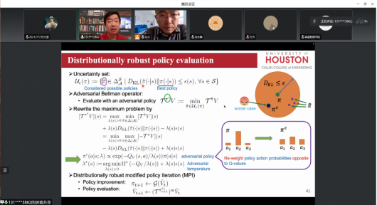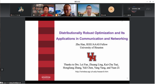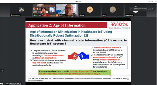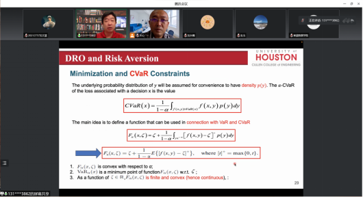 分布鲁棒优化算法的关键在于构建分布的不确定集,构建核心在于根据真实分布包含在一阶矩、二阶矩等满足一定条件的集合中的不确定集的形式对算法进行分类。韩竹教授详细讲授了分布式鲁棒时延优化算法和结果以及医疗行业信息时代的最小化使用分布鲁棒优化现状,并提出对未来研究的看法。在答疑阶段中,与会教师和同学们结合教授给出的示例以及时代技术热点分别从新能源电网稳定性维持要点、针对多个分布连续变化建立模型、提高分布式学习中收敛速度等方面提出问题,韩竹教授给出中肯的解答和对研究方向的建议