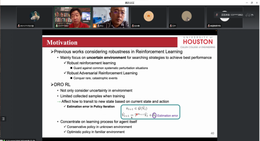 在本期数智百家讲坛中,韩竹教授列举了基于离散度的DRO优化;DRO、风险规避和CVaR;基于DRO的强化学习三类情况。他将鲁棒优化详细分为随机规划、稳健优化以及分布式稳健优化,通过函数公式对不确定性下的决策和分布式鲁棒优化的背景作出解释,详细讲解了分布式鲁棒优化技术、其所应用的数学基础以及其无线通信领域的应用。与会教师通过和韩竹教授深入交流,加深了对于鲁棒优化在通信领域应用的认知和理解。