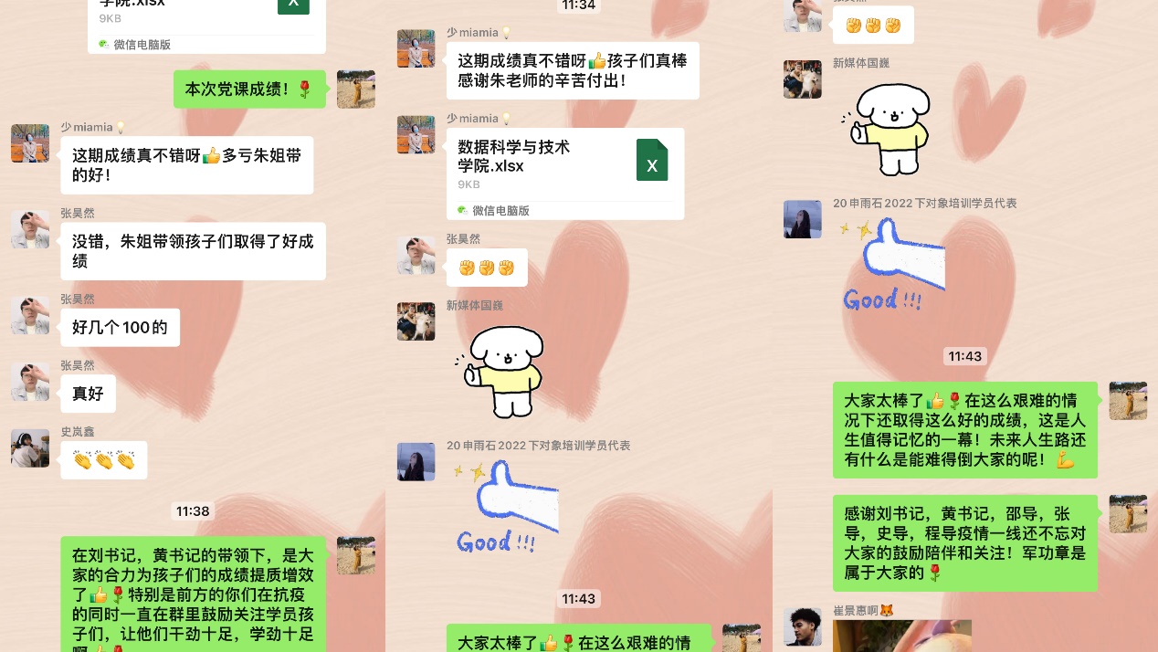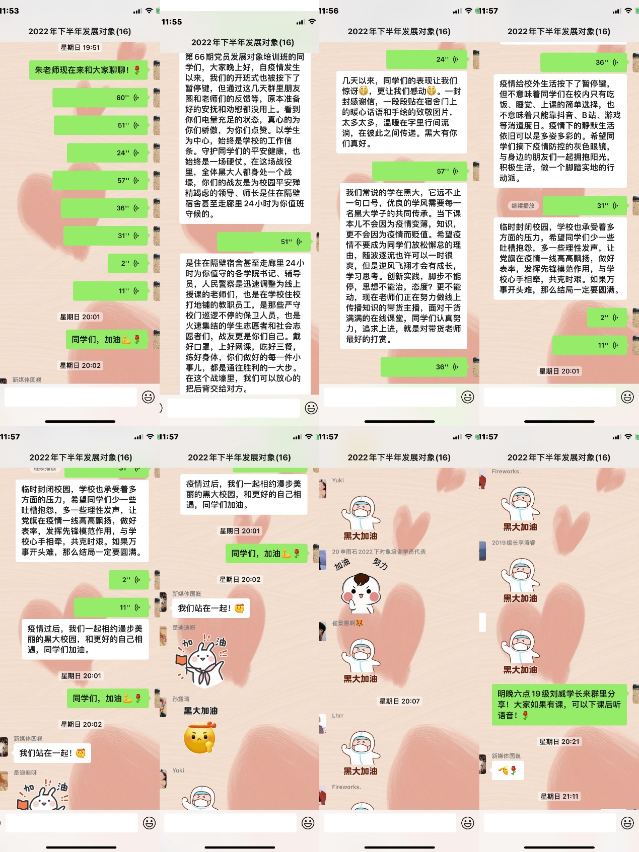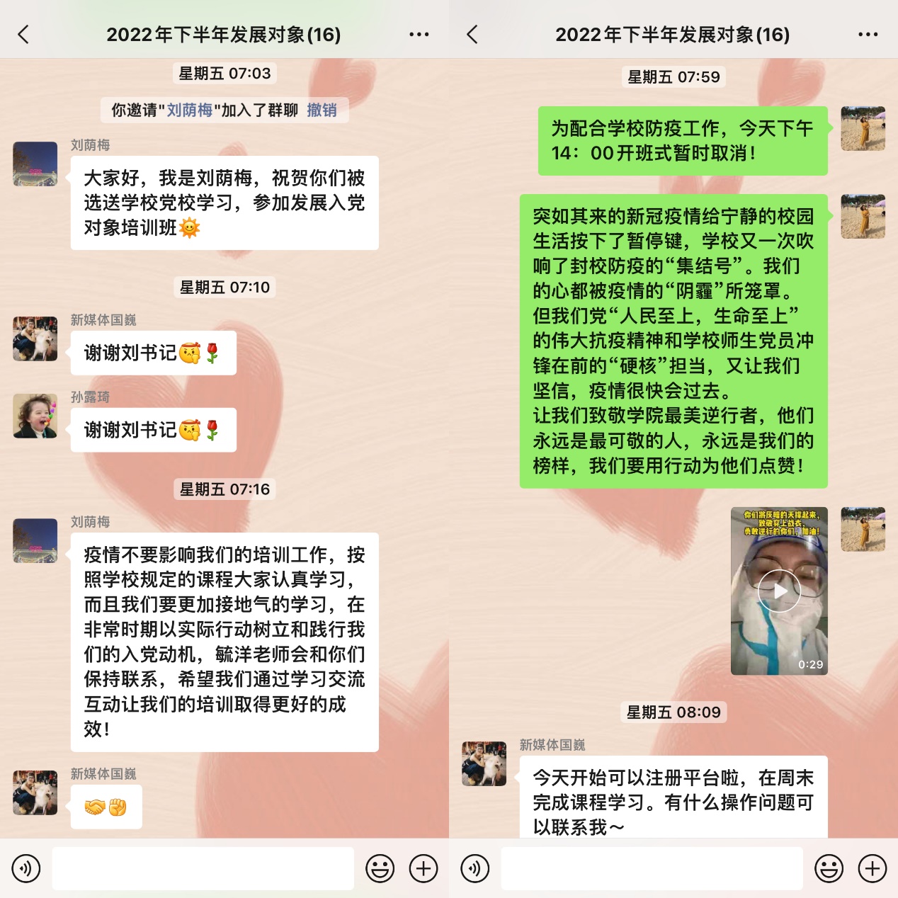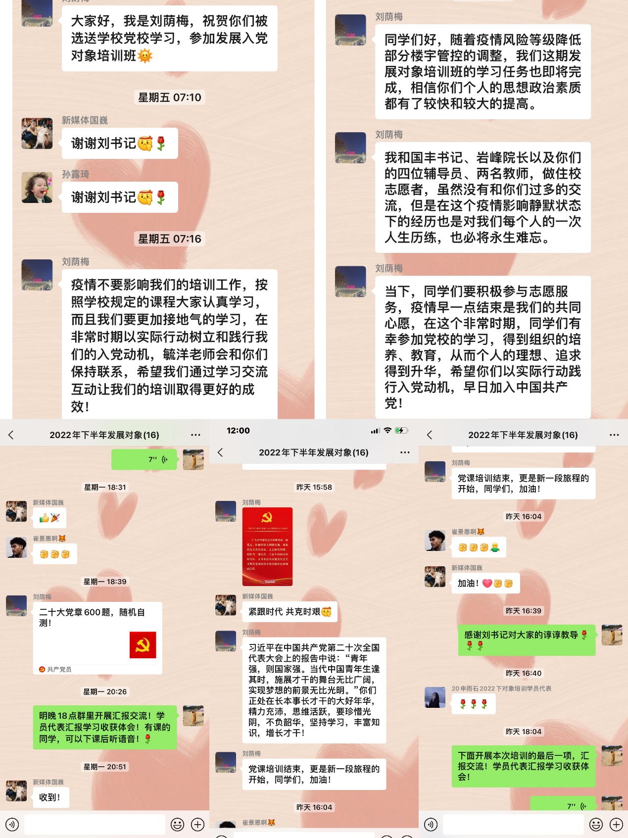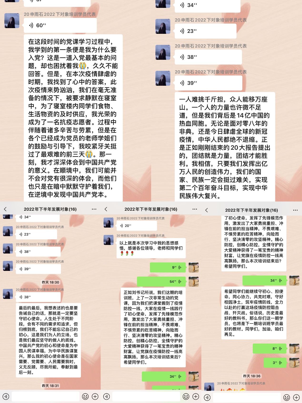 担当彰显初心,实干践行使命。培训期间,党总支书记刘荫梅一边忙于志愿服务,一边致力于学员培训。以家长般的关爱给予学员们倾情教育和引导。副书记黄国丰、员工一、三支部书记邵明琛、张昊然也加入培训群关注关爱员工们,给学员们极大的精神支持。