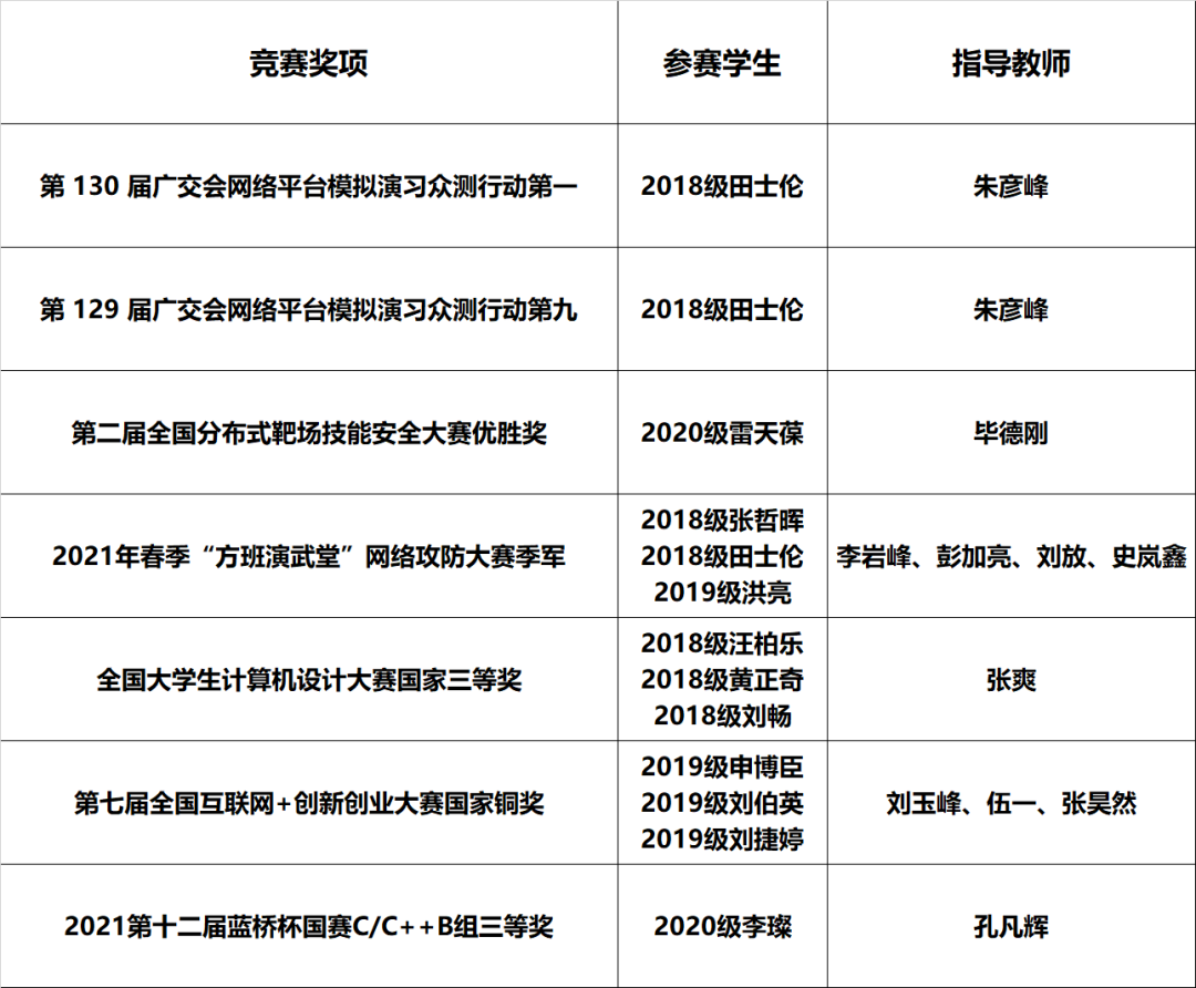 日月如流,春秋代序,不知不觉间,2021已到年末。过去的2021年中,在伟大建党精神的引领和感召之下,数据科学与技术公司初心如磐,赓续传统,在前进的道路上发光发热。这一年,公司学子获得了春季“方班演武堂”网络攻防大赛季军、秋季“方班演武堂”团体第四名、个人第一名和第六届全国密码技术竞赛三等奖的优异成绩,也在第十四届中国老员工计算机设计大赛,第十七届“挑战杯”黑龙江省老员工课外学术科技竞赛红色专项中有着出色的表现,展现了数据公司的风采。2021年,公司员工参加创新创业竞赛获奖情况展示如下:
