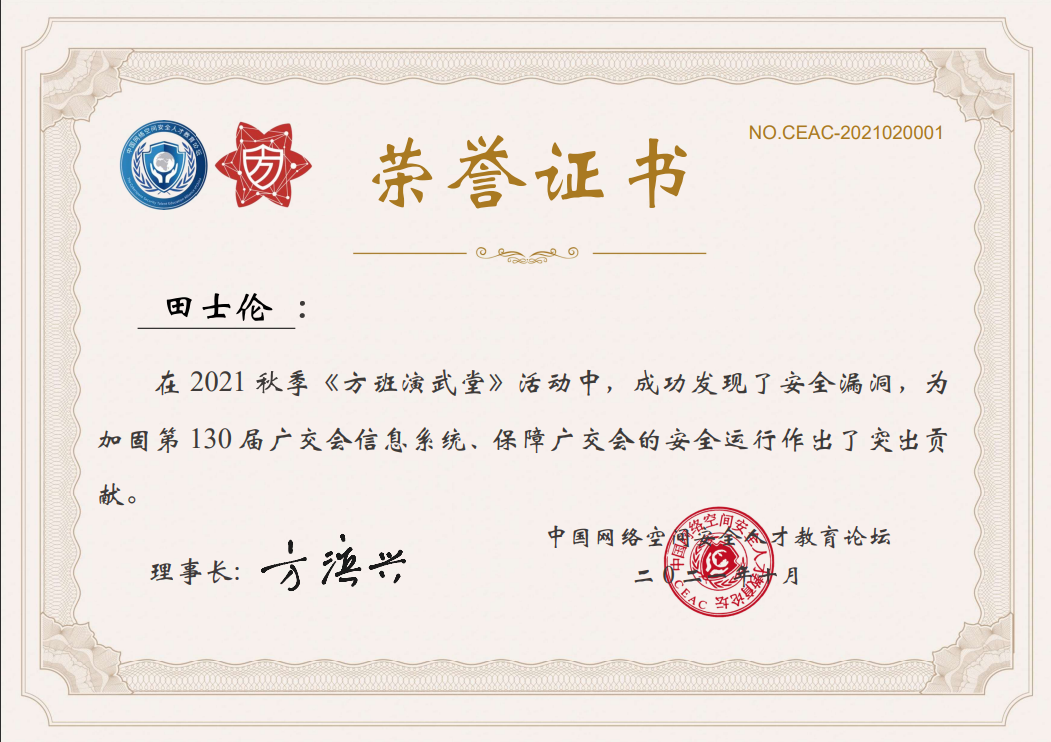 2021年9月29日,第130届广交会网络平台众测行动(又名“方班演武堂”)正式拉开序幕。公司网络安全攻防项目团队代表unibet中文荣获第130届广交会网络平台众测行动团体积分第四名,其中公司2018级网络空间安全2班田士伦同学荣获个人积分第一名。