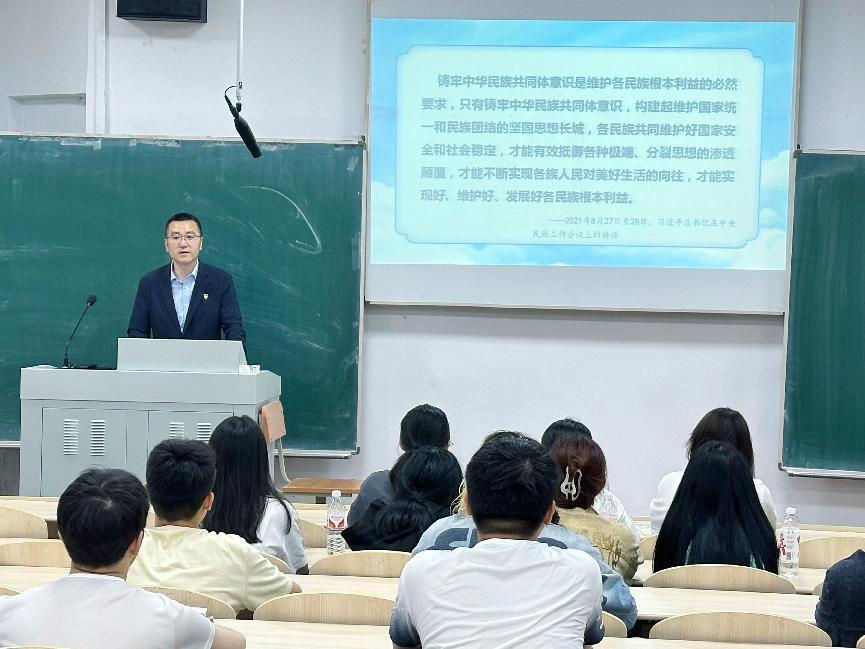 王磊以习近平总书记在中央民族工作会议的讲话为核心,为2023级网络空间安全专业新生开展了“铸牢中华民族共同体意识战略意义”专题思政课。王磊采用师生探究的课堂模式,带领同学们深刻体会了铸牢中华民族共同体意识的战略意义,为同学们解读了把握中华民族共同体意识的丰富内涵,使同学们深刻认识到铸牢中华民族共同体意识的实践路径。